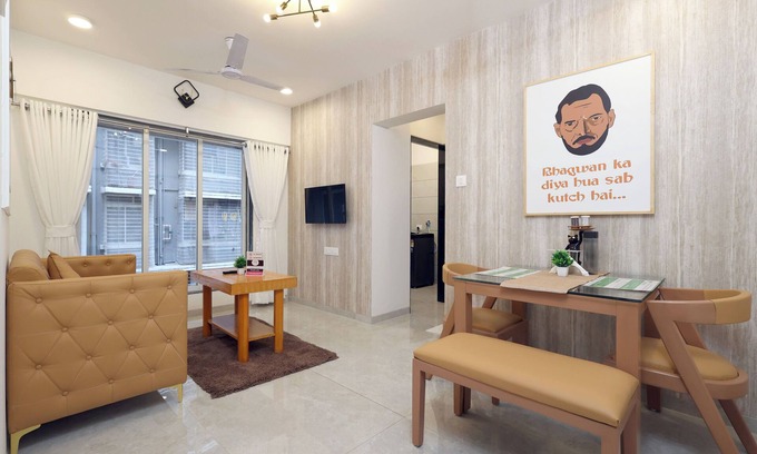 Step into a one-of-a-kind 1 BHK apartment where comedy meets creativity! Inspired by the iconic Bollywood film Welcome, this quirky yet cozy stay features the legendary Majnu Bhai’s donkey painting and framed Nana Patekar dialogues that bring a smile the moment you walk in.