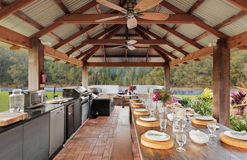 A 20-seater dining table with lounges, ceiling fans, an outdoor TV, a music system, and a large open fire.