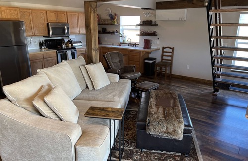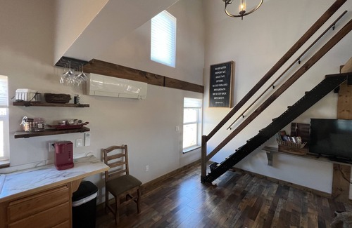 Upstairs loft bedroom boasts a king bed with crisp sheets, down comforter and weighted blanket that you will never want to leave. Large open closet area to store all your items, oversized chair for reading and relaxing. .