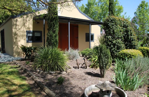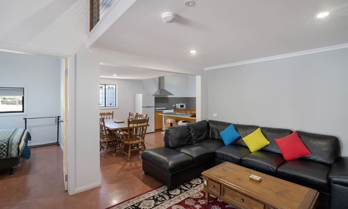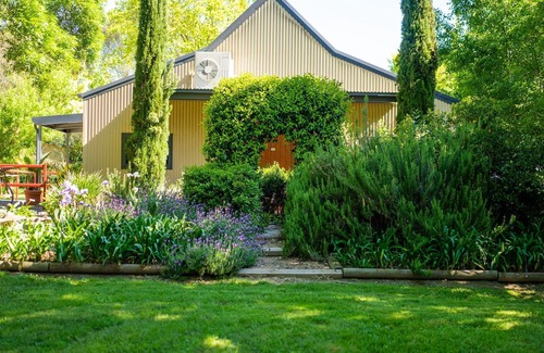 The Barn is our 3 queen bedroom, fully self contained loft-style accommodation set to full disability standards, nestled among established gardens and with rural views. It is an ideal hideaway for couples or a great family retreat. The property boasts private Tumut River frontage making The Barn ideal for trout fishermen or water sports and is within walking distance to town. Situated on a working cattle property makes for a quiet and relaxing stay. The Barn overlooks the biggest elm tree in the world.
