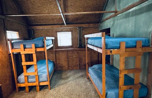 Very rustic and open air. 2 bedrooms downstairs have king beds. 2 bedrooms upstairs have a queen bed and 4 bunk beds in each room. Kitchen has concrete countertops and wooden cabinets.