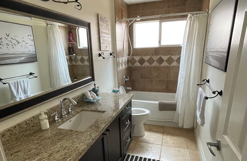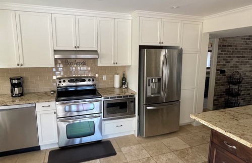 This beautiful property offers a heated salt water pool, in quiet neighbourhood, only a 5min drive to white rock beach and 8 min drive to crescent beach. Enjoy a private entry, large patio, and use of the pool. Venetian styled suite decorated in a whimsical beach theme. Large chef kitchen, with island bar seating, fully equipped with all the amenities.