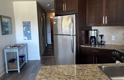 This TOP FLOOR Beach themed condo has 2 lovely king sized beds. It will comfortably sleep 6 adults + small children as it has a queen sofa bed in the main living room and a small single sofa bed in the lock off "B" side. This is perfect for more than 1 family or a big family traveling together. There is a smart TV in the main living room and 2 additional TVs. The kitchen has stainless steel appliances and provides all the essentials needed to cook, long or short term. There are 2 full bathrooms. One has a jetted tub/ shower combo while the larger bathroom has a separated jetted tub and walk in shower. There are 3 patio doors onto 2 balconies. One patio door is off the main bedroom and leads to the balcony overlooking the estuary and boasting gorgeous ocean views. There is underground parking available (6’10” clearance)and a gravel lot for additional parking.