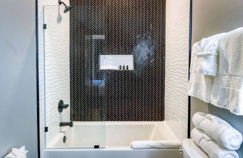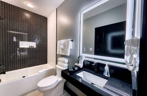 • The modern bathroom boasts a shower/tub combo and a lighted LED mirror.