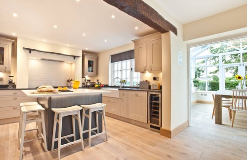The kitchen opens out into a large sunny conservatory where you'll find a huge dining table made out of reclaimed wood that seats 8 people.