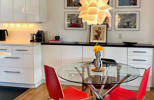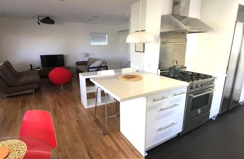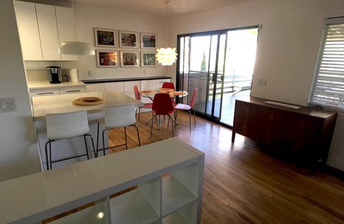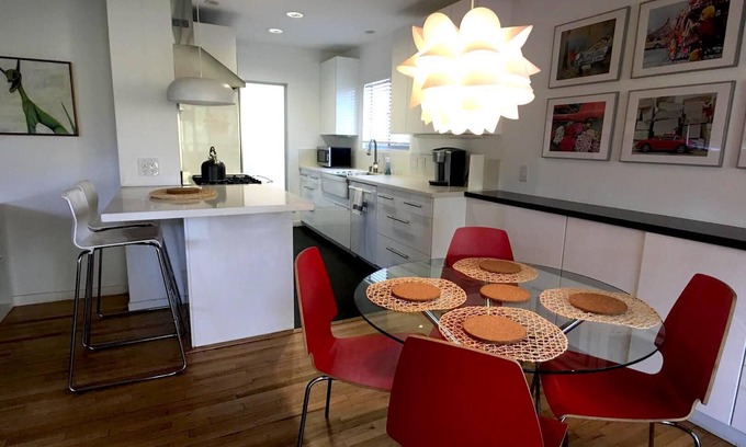 Stay in this designer decorated multi-level mid-century modern home with city views. This unique 2 bedroom, 1 and a half bath is 15 minutes away from Burbank Airport, Universal Studios, Dodger Stadium, Downtown Los Angeles, and Griffith Park Observatory and Greek Theatre. Enjoy all the comforts of a five-star hotel and sleep in a comfortable king size bed with on suite bathroom that boasts an oversized jacuzzi tub and steam shower. The second bedroom is diverse in that you may enjoy two twin beds or push them together to create a beautiful night's sleep in a king bed. The upstairs living has a gourmet kitchen, dining room, and open concept living room. Relax with your morning coffee and read the newspaper as each level has its own patio, while the upper level overlooks an extra large deck complete with ping pong table and views of the city. Enjoy classic California indoor/outdoor living at this property. The laundry room with full-size washer and dryer, iron, and ironing board, is available to you (why ruin a perfectly good vacation by doing laundry?). Covered parking for two vehicles is just steps away from the front door.