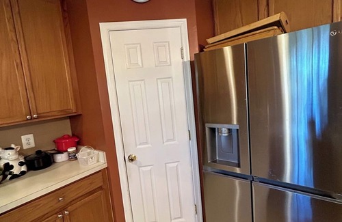 House has a main floor master suite and large living room with cathedral ceiling. Eat in the kitchen or take dinner to the beautiful bar in the living room to watch one of the house's large screen TVs. The four bedrooms combine to have 2 king beds, two twin beds, 1 bunk bed (with full bed on bottom and twin on top). Property is perfect for families or groups of friends (but no parties, please). New dual-zone HVAC ensures comfortable temperatures upstairs and down. In-home washer and dryer. Lots of kitchen amenities including toaster oven, pop-up toaster, water heater, microwave, range, dishwasher and a new refrigerator with in-door icemaker and water dispenser. Plenty of counter space with a kitchen island. It's nothing terribly fancy, but it's got everything a kitchen needs (plenty of pots, plates, utensils, etc.). Dining table in the kitchen has a bench that seats three, two chairs along one side, and space for another chair or two at the end of the marble-top table. Overflow beyond the kitchen table goes to the four seats at the bar in the living room just steps away (what fun!).