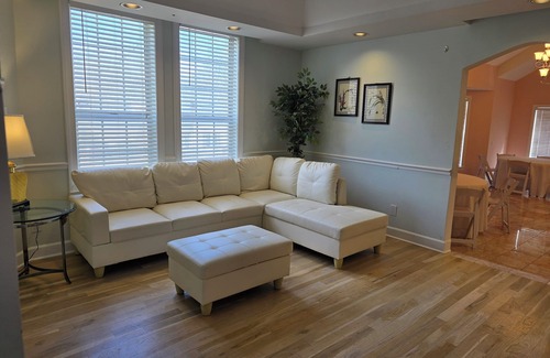 Get ready to relax in this big 10,000 sq ft, spacious house in Nashville. This gorgeous property features 4 upper level bed rooms plus 3 lower level bed rooms totalling several rooms and 6.5 bathrooms, perfect for large groups and events while also allowing you and your group their own privacy. The whole group will be comfortable in this spacious and unique space. There are a total of 9 bedroom beds, 3 blow-up matress beds and 1 roll-away bed, for a total of 13 beds, creating numerous sleeping arrangments for your group. This house is located only 3.5 miles from the Nashville airport and 16 mins from downtown. This house also has a spacious 650 sq ft event room, for dinners, events, birthday, batchlor & batcholoret parties and any other event you can imagine. It also offers plenty of space for entertainment. The tables and chairs in the picture are included, with additional chairs,