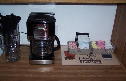 The kitchen is fully stocked with all of the essentials, including serving dishes, silverware, cups, glasses, mugs, pots, pans, griddle, toasters, microwave, blender, coffee maker, mixing bowls, measuring cups, strainers, and basic spices.