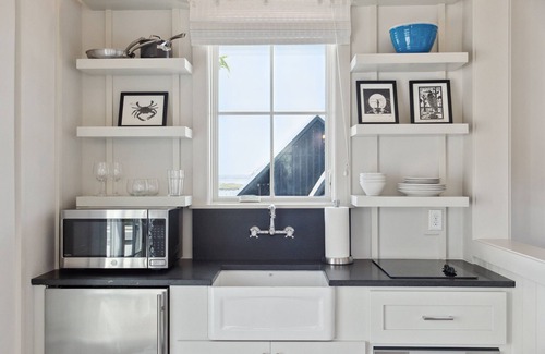 The Bluebird offers a small kitchenette, Keurig style coffee maker, cooktop, dishwasher, microwave, stand-alone ice maker, mini fridge, king bed and walk-in shower with tub. Washer/Dryer is provided. There are 16 steps to enter the 2nd floor property. There is an outdoor shower under the bungalow in the garage. The outdoor porch is a perfect place to take in breathtaking coastal views.