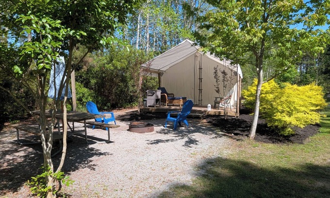 Escape to a serene coastal retreat just 2 miles from Holden Beach, North Carolina, and experience glamping at its finest. Nestled in a peaceful, natural setting surrounded by whispering pines and soft ocean breezes, this luxurious outdoor getaway offers the perfect blend of comfort and nature. Whether you’re sipping morning coffee with birdsong in the background or ending the day with a peaceful evening by the fire, this glamping experience offers tranquility and charm just minutes from the beach