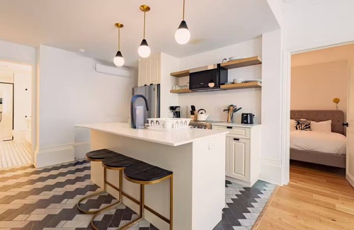 • The spacious kitchen island offers the perfect spot to enjoy meals together — whether you’re savoring a homemade dish prepared in the fully equipped kitchen or sharing delicious takeout from one of Montreal’s fantastic restaurants.