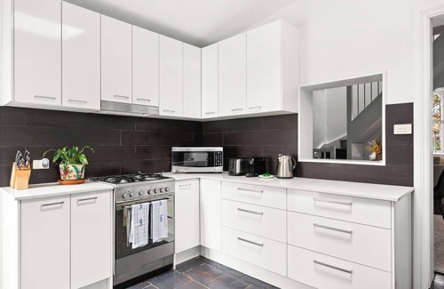 Stepping in, the living area is a cosy space to unwind after a busy day. Delve into your favourite book or enjoy a spot of TV. Moving through to the dining area, a table makes it easy to share a meal at home or use it for setting up a laptop if you’re on a working holiday. There’s a full kitchen for your holiday catering, equipped with high-quality appliances and cooking utensils. From here, head out to the courtyard, where alfresco seating allows you to soak up the Sydney sunshine.