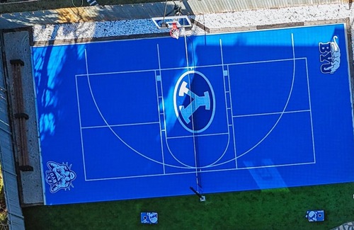*Beautiful custom sports court with royal blue tiles and three BYU logos for basketball and a net that adjusts for pickle ball tournaments or group volleyball games