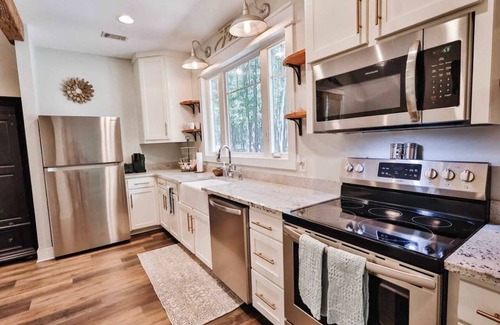 This 2-bedroom cottage features an open-concept living room with vaulted ceilings, a large smart TV, and a gas fireplace, creating the perfect space to unwind. The kitchen is fully equipped with granite countertops, a farm sink, and modern appliances for easy meal preparation. The master bedroom includes a queen bed and smart TV, while the second bedroom has a daybed with a pop-up trundle, ideal for children or extra guests. A tiled shower with a rain shower head adds a luxurious touch. Outside, a fire pit with Adirondack chairs and a gas grill offer great options for outdoor relaxation.
