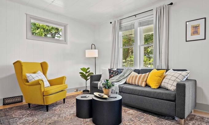 - Bedroom 1: Queen bed + yellow feature wall