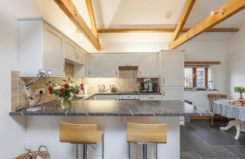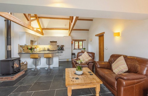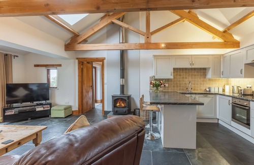 Bedroom: Super Kingsize (6ft) Bed Ensuite: Bath, Cubicle Shower, Heated Towel Rail, Toilet. Oil underfloor central heating, electricity, bed linen and towels. Initial fuel for wood burner included, remainder available locally. Enclosed courtyard garden with patio, sitting-out area and garden furniture. Bike store. Private parking for 2 cars. No smoking. Please note: There are 2 steps to the patio. This property is not suitable for guests with limited mobility.. Glorious uninterrupted sea views can be enjoyed from this delightful romantic retreat on the edge of a small mixed livestock farm. This spacious, single-storey barn conversion cleverly mixes olde worlde charm with modern living. Near Hartland, it is ideal to explore this AONB; perfect for walkers and bird watchers with delightful beaches close by. North of Hartland Point is picture-postcard Clovelly. Cycling, riding, surfing, sailing and fishing available locally. Shops and six pubs within 5 miles.