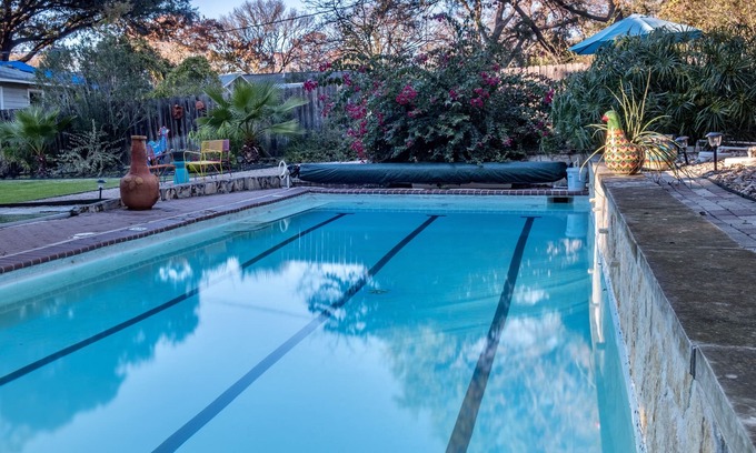 I have an immaculate home with a great Austin vibe. Bedroom 1 has a King size bed and full bathroom with tub. Bedroom 2 has 2 twin beds and full closet. Bedroom 2 and 3 share a modern/vintage inspired bathroom directly across the hall. Bedroom 3 has a queen bed. Bedroom 3 has it's own key pad entrance that leads to the back patio with hot tub right outside your door. Bedroom 4 is attached to the main house but also has its own private entrance. Attached to it is a small private bathroom with a sink, shower and toilet. Bedroom 4 has 1 queen bed and a full size futon bed. There is a flat screen TV, Roku, stereo system, DVD player, ceiling fan, bar sink and armoire in your room. You will also be able to enjoy a backyard paradise including a huge back patio with a BBQ grill, fire pit, mature trees, and a lap pool. We also have a Jacuzzi hot tub for your enjoyment.