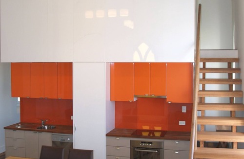 Original features were retained when the property was renovated and as much of the new work was done using materials recycled from the original building. The floor of the church is beautiful original timber. The narrow floor boards in the 'shed' side were recycled from the shearing shed and are soaked in lanolin from the fleeces. The orange colour on the kitchen is derived from the coloured glass above the entry doors when the sun streams through it.