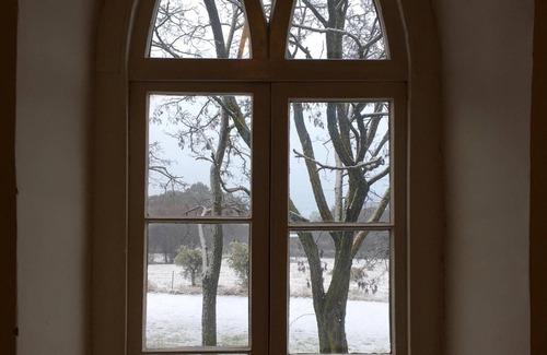 The large bathroom contains a free-standing bath, separate shower, toilet, vanity and a ceiling mounted heating panel. The bathroom has a large picture window with views across the rear yard and adjoining farmland, very private and picturesque, and an original pointed arched window which can be opened up for views into the church and out the opposite side window.
