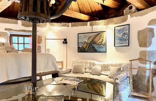 The mill is located, quiet and intimate among forests, in the secluded Villa de OBarqueiro, a tiny picturesque fishing port, firm at the sea entrance of the Ría Sor, still vigilant at the maritime entrance of the North Seas.An original construction of thick solid stone walls, with its handcrafted wooden dome, crossed by its axes and entire chestnut beams, offers us a unique vision of living an archaeological experience, but modernized to the comfort of our times for very personal.