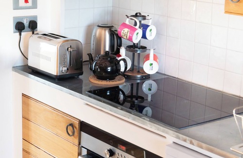 -well equipped kitchen with built-under electric oven and electric induction hob, recirculating extractor fan, dishwasher, fridge freezer and microwave.