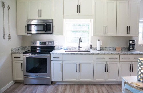 This lovely, cottage offers a relaxing, upscale retreat on your own private 1/2 acre lot. Perfect for a business traveler, vacationers, a couple or small family. It features 1 bedroom with a queen size bed, cozy living room area with a pull out full size sleeper sofa bed, 1 bathroom with a stand up shower and fully equipped kitchen with coffee maker, pots, pans, utensils, flatware, silverware, knives, ect.