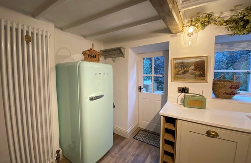 Amenities: Central heating. Oven, induction hob, microwave, fridge/freezer, washing machine, slimline dishwasher. TV, WiFi. Record player with records available for use. Fuel, power, and starter pack for woodburning stove inc. in rent. Bed linen and towels inc. in rent. Off-road parking is available, but it is a shared driveway on a first-come, first-served basis. Non-enclosed front patio with bench. Enclosed rear courtyard with decking and furniture. Sorry, no pets and no smoking. Shop and pub 0.1 miles, river 0.2 miles. Note: Step up from living/dining area to kitchen. Due to the traditional nature of the property, the stairs are steep and narrow, therefore, the property may not be suitable for individuals with limited mobility. This property only accepts a minimum of 2 night stays