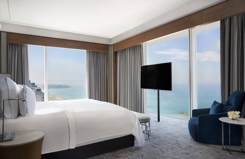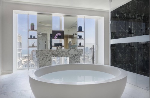 The David Kempinski Tel Aviv offers 250 air-conditioned accommodations with minibars and laptop-compatible safes. Accommodations offer separate sitting areas. Beds feature down comforters and premium bedding. A pillow menu is available. 55-inch Smart televisions come with premium digital channels. Bathrooms include separate bathtubs and showers with deep soaking bathtubs and rainfall showerheads. Bathrooms are also outfitted with bathrobes, slippers, and designer toiletries.