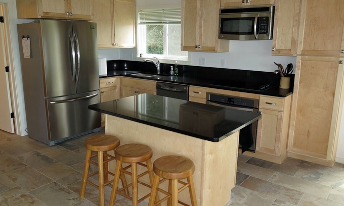 This attractive three level home is good for families or couples wanting some privacy. Ground floor King bed as well as a fold out couch allow for 4 to sleep in one room. This room has a large flat screen TV and gas fireplace creating a cozy atmosphere. There is a bathroom with tile shower on this floor. A modern kitchen and open living area on the 2nd floor capture views of the ocean and access to a west-facing and south deck with BBQ. This floor also has a small TV room that serves as a bedroom with foldout couch, and a bathroom with 2 sinks and a bathtub, and adjoining large capacity laundry room. The master bedroom on the 3rd floor faces west to see Haystack. The other 3rd floor bedroom has 2 queen beds, antique furniture, a reading nook, also with Haystack view, . The top floor bathroom has an attractive tile shower, & skylight. Your "must have wi-fi" members will enjoy high speed connection with good reception in all locations of the home. Flat screen TV and a nice sound system on the 2nd floor offering iPod or iPhone connection to play Pandora selections, if desired. TV in master bedroom and ground floor as well.