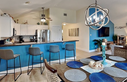 As you arrive, be greeted by the charming front porch adorned with Adirondack chairs, offering panoramic water views and the soothing rustle of palm trees. Step inside and feel the coastal vibes wash over you, setting the tone for a relaxing retreat.