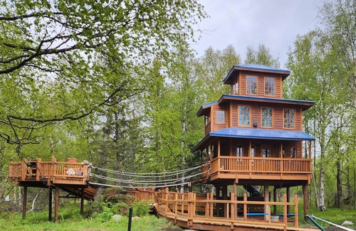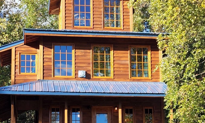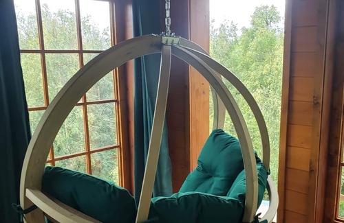 Come and sleep in the trees in Alaska! This cabin is a free standing treehouse (up in the trees but not attached to the trees). It has a kitchenette area and 2 bathrooms (one with a shower). It offers a king size bed on the 2nd floor and a full size bed on the first floor that rests on the floor under the stairs.