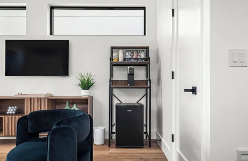The home features a cozy living room, a coffee bar, and a mini fridge—perfect for keeping drinks and snacks on hand while you explore. While there’s no full kitchen, you'll be just steps away from some of Austin’s best dining spots.