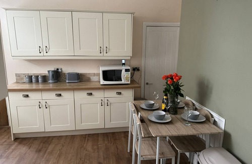 The living area creates the perfect atmosphere to unwind, with a plush sofa decorated with cushions, traditional fireplace and deep green feature wall. This makes it an ideal area to enjoy your favourite TV shows using your favourite streaming platforms. The kitchen is well equipped with utensils, crockery, a kettle, toaster, microwave and basic pantry items such as oil, salt and pepper. Additional kitchen amenities include an oven, induction hob, refrigerator, freezer, washing machine and tumble dryer.
