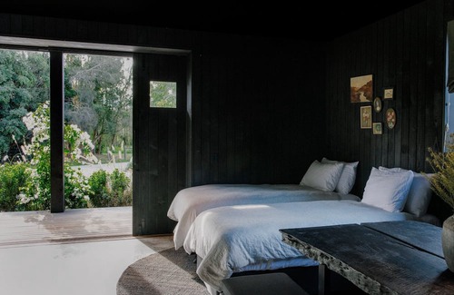 The master suite epitomises luxury, boasting a custom velvet king bed with a TV lift footboard at its centre. Floor-to-ceiling drapes envelop the space, while premium linens and indulgent Le Labo and Kevin Murphy amenities ensure a restful slumber. Step into the ensuite and immerse yourself in tranquillity as you soak in the large freestanding tub beneath the stars, framed by a custom skylight. A stylish walk-in robe adds to the suite's allure, offering discreet storage, while direct access to the gardens via a private deck offers enchanting views across the acreage.