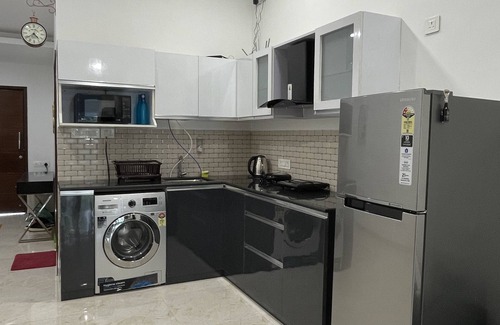 • A fully-equipped modular kitchen that has induction with chimney, basic utensils, cutlery, fridge, microwave-oven, water purifier, electric kettle, toaster, washing machine.