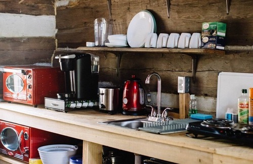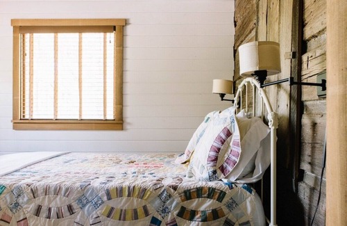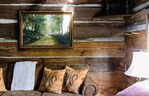 The Senator Cabin has a king bed in the Great Room and a separate bedroom with a queen bed. Thjere is a kitchenette and a large smart tv. This is a one of a kind vintage log cabin with fireplace, large porch, beautifully appointed fabrics and furniture, custom millwork throughout with claw foot tub and elegant shower and magnificent heart pine vanity. Two gracious bedrooms with AC and plasma TV- wifi and Internet.