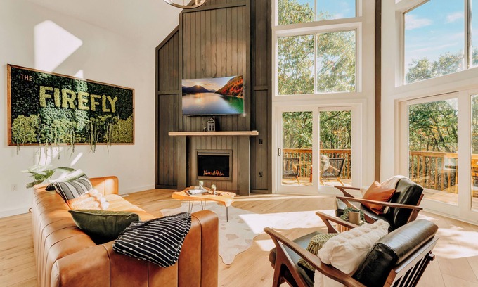 The Firefly: Chic Design Retreat with 3 Spacious Living Rooms, Cozy Firepit & Hot Tub | House in Albrightsville