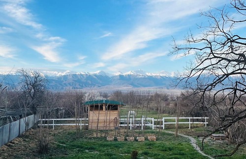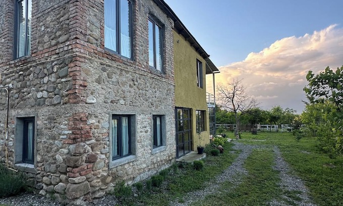The first floor of a classic farmhouse with its own shower and toilet. A cozy bedroom with a double bed and orthopedic mattress. There is a small kitchen with a stove, dishes and a refrigerator. There is a small workplace with a wonderful view of the mountains. At the guests' disposal: ancient wine cellar-marani with kvevri, covered veranda with mountain views.