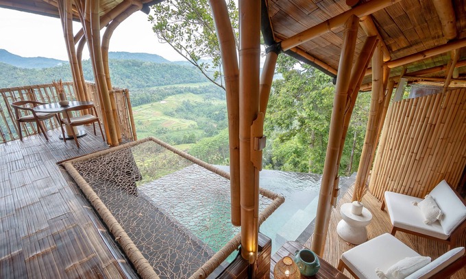 In your bedroom To the left, a glass wall that leads to your balcony highlights the lush view of the valley below. A large, private soaking tub on the balcony overlooking the valley invites you to soak up possibly the best views of Bali as you release your worries.