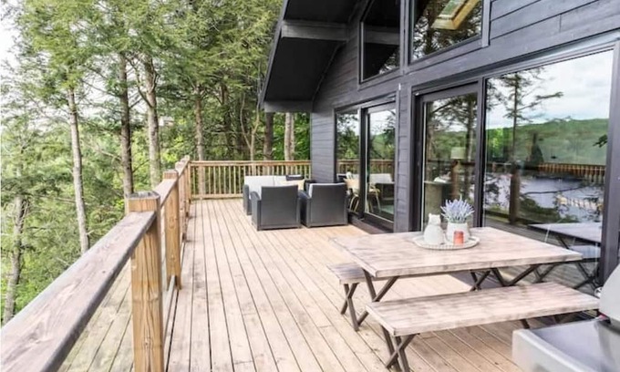 About 120 steps from the water with private lakefront. Down by the lake, we have a deck platform with lounge chairs and another area for bonfires. A long dock with full afternoon sun and deep water access for parking your boat. We have a canoe, an adult paddleboard, 2 kids kayaks and 1 kids paddleboard. We have a few adult and kids life jackets but we recommend you bring your own for the best fit. Kennisis Lake Marina (less than 10 min away) has boat and personal watercraft rentals. New pickleball courts and a fry shack, ice cream/coffee bar.