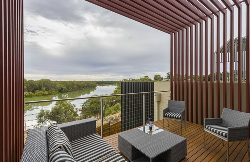 Separating the bedrooms is a spacious wet area featuring a 6-person indoor hydro-therapy spa and Smart TV. A fully equipped kitchen is the feature of the living space that opens out onto a private balcony, overlooking the Murray River.