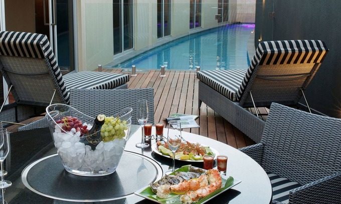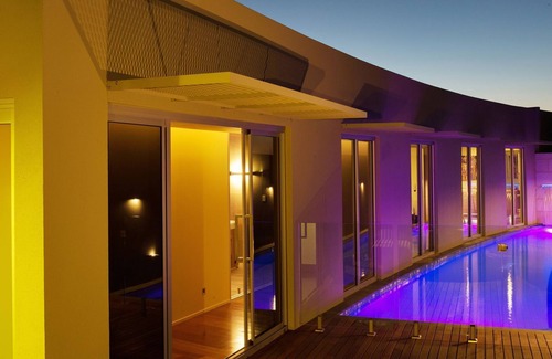 Relax in the courtyard beside the heated outdoor lap pool while a rain-shower waterfall at one end creates an ambient atmosphere when paired with the underwater mood lighting.