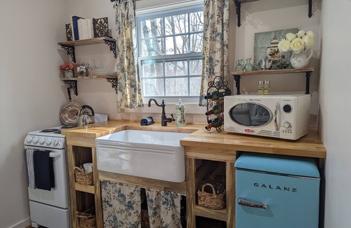 The French Secret is a 1 bedroom and 1 bathroom romantic cottage. The place offers a kitchen and a dining area. In addition, you can enjoy the bistro table on the front porch. Finally, there is a nice set up by the small creek with a charcoal grill, a gas fire pit and a couple hammock. The bathroom provides a 2 persons bathtub. And you can even enjoy the outdoor shower!