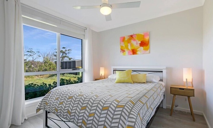 The Friendly Pelican is a light, fun-filled, and dog-friendly two-bedroom holiday home in picturesque Metung. The property offers a large, fenced yard, ideal for families and pets, and is equipped with a full kitchen, a luxurious walk-in shower, and a cozy living area with games and DVDs. It features a covered back patio with a rural view and is located near a beautiful walking track. Additional amenities include WiFi, parking for two cars, and a boat trailer.