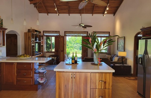 Quinta Colina Paula sets itself apart from any other rental property in Atenas. This well maintained and gorgeous 20 acre estate is located in an excellent residential area named Barrio Mercedes. It is only a 25 minute drive away from the San Jose airport (SJO) and 4 minutes from the center of quaint Atenas with all the amenities and services. It is conveniently located near many tourist attractions. Yet you are welcomed to a grand tropical paradise. Be ready to be amazed as soon as you arrive to the gate of this estate. You will enter past tropical plants and trees, past the caretakers Meylin and Manuel's house, lovingly painted by the talented artist Eighi, down to the first river with protected native trees and up to the house. Not just any house. A home which has been lovingly and meticulously prepared for your arrival. This home was built in the typical and authentic Costa Rican style with native woods. It offers 3 wrap around porches with very different views: the mountain and volcano range, the tropical garden and the secluded, enchanting pool area. Ample comfortable seating and hammocks will make your choice as to where to hang out and take in these breathtaking views very difficult. No effort nor expense was spared to create a home away from home. With an open living plan, well stocked kitchen, beautifully appointed bedrooms and bathrooms, TV area and dining spaces, you will be able to kick back and enjoy immediately.