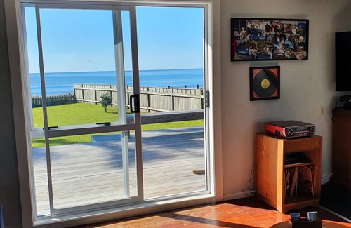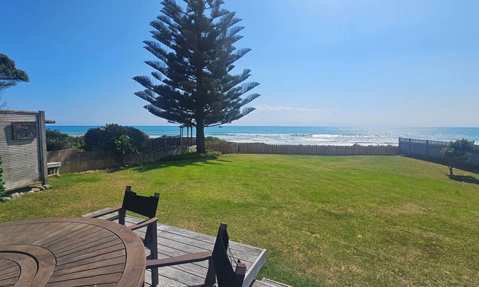 Simple furnishings complement the laid-back beach vibe, with a large deck and spacious lawn for outdoor lounging. After a day at the beach, rinse off in the hot outdoor shower. Enjoy easy meals with a fully equipped kitchen and BBQ on hand. On cooler nights, stay cozy inside with the heat pump and enjoy movie nights or board games from the collection provided.