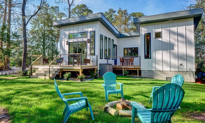 Windows and decks allow you to overlook the courtyard with an outdoor dining table, yard with fire pit, grill, games and hammock. Stroll down to the dock to enjoy your morning coffee and watch the herons and cranes. Bring your paddle board or canoe for a paddle!
