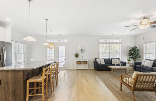 This 3-bedroom house in Oak Island is perfect for your escape to relaxation. With a king bed, queen bed, bunk bed, and twin bed, this adorable property can comfortably accommodate your group of up to 8. Enjoy the convenience of two full bathrooms. There is also an outdoor shower, perfect for washing off after the beach. Our place is serene, clean, and clutter free. We have a fully equipped kitchen if cooking is your thing, if not, we're close to many restaurants and in walking distance to the popular Salt 64.