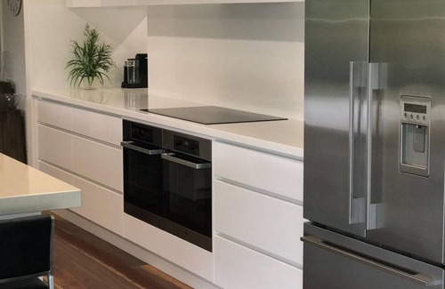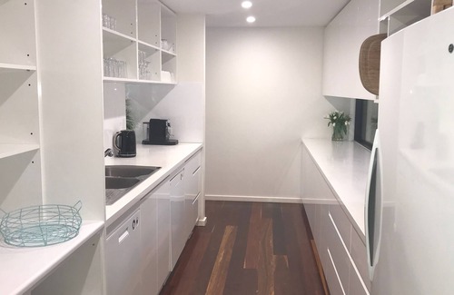 The first thing guests say when they walk into this property is WOW!! The property is on 1 acre and has its own concreted dam with waterfall. With the amazing landscape, enormous swim spa and amazing house, you will feel like you are at your own secluded and private resort. The house itself is huge with open plan living and a massive kitchen and a butlers pantry to please the most fussy cooks. There wont be an issue with space with your whole group will be able to be in the kitchen at once. With two Miele Ovens, two dishwashers, two fridges and a high end Induction Cooktop you will never want to cook any where else. If that is not enough the outside entertaining area has a built in BBq and also another BBq is on the back deck. Yep WOW!!